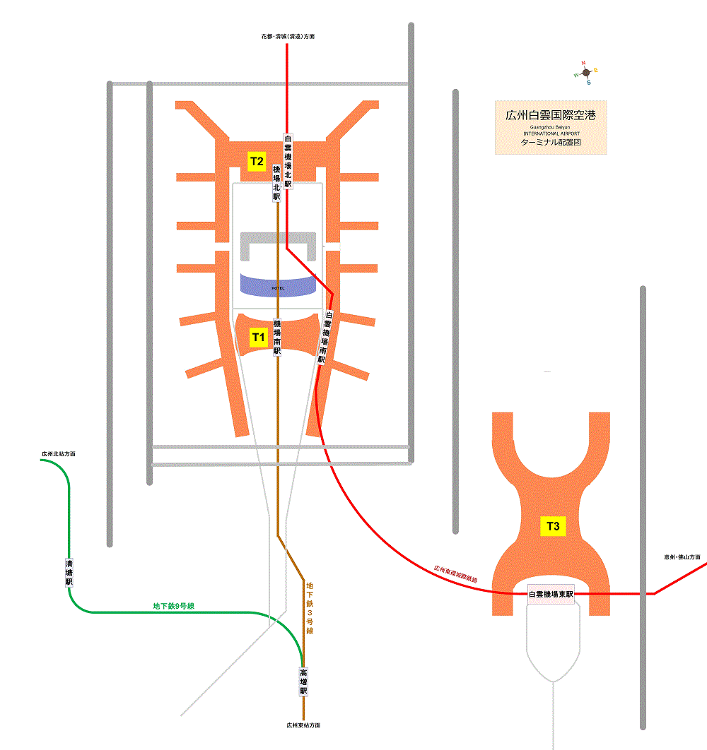 或いは都市間鉄道の広州東環城際鉄路を利用して白雲機場北駅(T2)、白雲機場南駅(T1)より白雲機場東駅(T3)へ移動することも可能となっており、さらに恵州や東莞、肇慶、佛山、清遠方面から直接T3へ乗り入れることが可能としている。